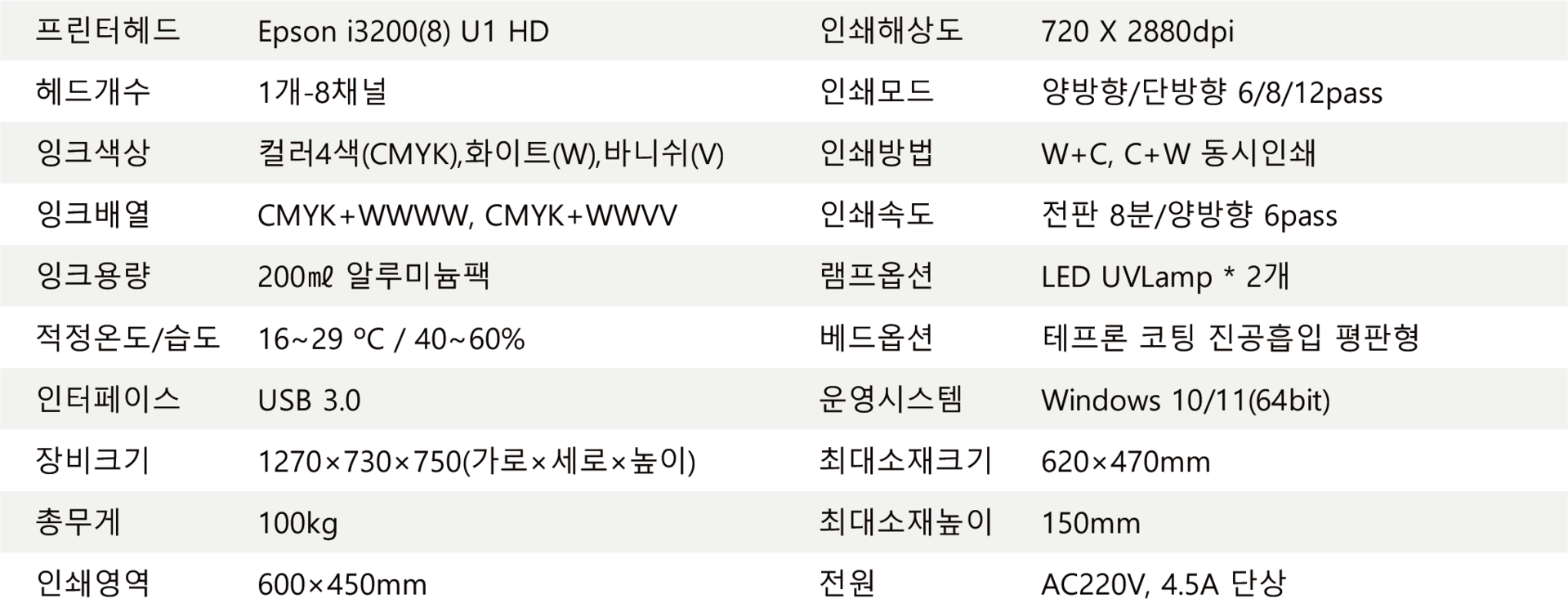 EPSON i3200(8) U1 HD 8채널 정품 헤드를 사용하여 2400dpi 고해상도 구현, 3200개의 노즐이 빠른 스피드를 보장하여 화이트+칼라 동시 인쇄로 8분에 600mm X 450mm 전판인쇄 출력이 가능